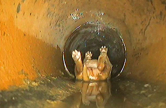 据英国媒体报道,仅有一周大的小狗戴诺当天被他4岁的小主人丹尼尔从卫生间马桶冲入下水管道后奇迹生还。丹尼尔说,当时他是想给戴诺洗个澡,才把它放到马桶中的。图为6月15日发布的录像截图显示小狗戴诺被卡在下水管道里。