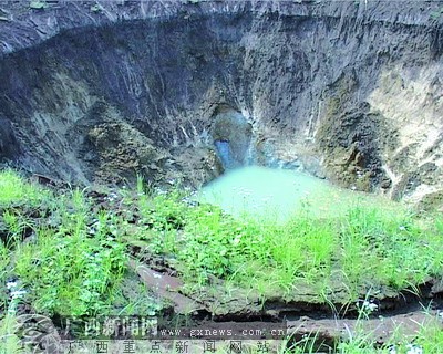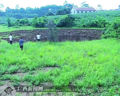 6月13日,广西武鸣县双桥镇伊岭村一口干涸的鱼塘突然塌陷,形成了一个直径约80米、深20余米的圆形深坑,幸好没造成人员伤亡。坑周边的地面还裂开了很多口子,裂缝有继续扩大的趋势。目前,当地村民已在附近设置警示标志。