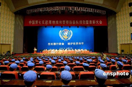 6月16日,中国第七支赴海地维和警察防暴队授勋暨表彰大会在新疆乌鲁木齐举行,公安部、新疆维吾尔自治区分别为其记集体一等功。公安部并为25名防爆队员记个人一等功,50名队员记个人二等功,50名队员记个人三等功;新疆维吾尔自治区团委授予该防暴队“新疆青年五四特别贡献奖”,授予一等功获得者“新疆青年五四特别贡献奖章”;新疆维吾尔自治区妇联授予5名女队员“三八红旗手”称号。