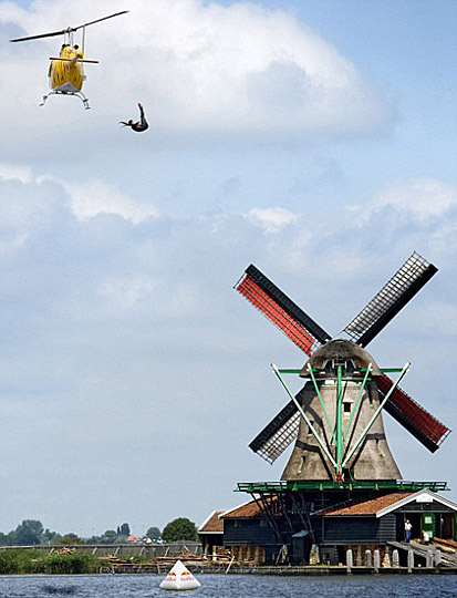 据英国媒体17日报道,正在荷兰赞斯堡备战红牛悬崖跳水系列赛第二轮的哥伦比亚选手Orlando Duque从飞翔在91英尺高空的直升飞机上纵身跳下。该次比赛将于6月20日在荷兰鹿特丹举行。