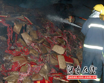 起火车辆是一辆半挂货车,车上装载物品正在燃烧并已经发生爆炸,浓烟冲天,燃烧物四散飞溅。在场民警立刻设置警戒线,疏散围观群众。距离现场一公里左右就可以看到事故地点浓烟滚滚,火光冲天,周围500米内到处是燃烧爆炸后的鞭炮壳。路上汽车已经排成长龙,双向车道全部封闭确保过往车辆及司乘人员的安全。株洲消防、路政部门积极救援,现场消防部门四辆消防车同时作业,前2辆消防车停在距起火车辆近20米处实施灭火,第三辆车铺设二条水带干线出二支水枪灭火,第四辆车负责供水,阻止鞭炮继续燃烧爆炸。