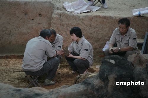 考古人员正在研究刚出土的一块碎片。中新社发 刘震 摄