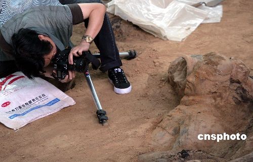 一名工作人员给刚出土的一个兵俑拍照片,以记录刚出土时候的状态。中新社发 刘震 摄
