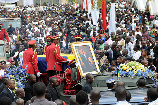 6月18日,在加蓬东南部的弗朗斯维尔市,人们参加已故总统邦戈的葬礼。