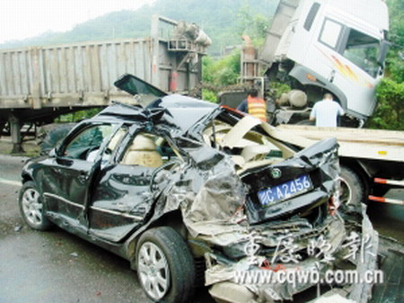 21日下午4时过,记者赶到现场,高速路执法队员正在处理现场,救护车刚离开,从白市驿到永川段的高速路口全面封闭。记者看到,被撞后的斯柯达轿车掉了个头,完全变形。