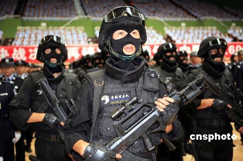 6月23日,雪豹突击队队员在安全保卫动员誓师大会上宣誓。当日,北京市公安局举行安全保卫动员誓师大会,刑侦、治安、巡特警等系统民警代表及武警北京总队代表参加。此次誓师动员大会的召开标志着北京市国庆60周年安保工作全面启动。