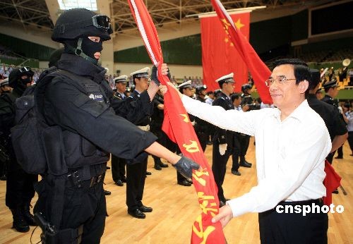 6月23日,在距新中国成立60周年还有100天之际,北京警方隆重举行国庆60周年安全保卫动员誓师大会。这标志着国庆60周年安保工作全面启动。图为北京市市委副书记、政法委书记王安顺为雪豹突击队员授旗。中新社发 谭志勇 摄
