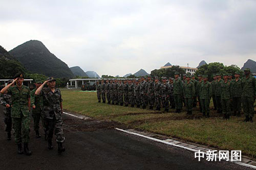 中方观摩团团长、解放军总参谋长助理戚建国少将和新方观摩团团长、新加坡武装部队联合参谋部参谋长陈振声准将,在结训仪式上共同检阅双方参训官兵。