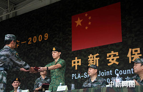 新方观摩团团长、新加坡武装部队联合参谋部参谋长陈振声准将向解放军优秀参训官兵颁发奖章和证书。中新社记者 孙自法/摄