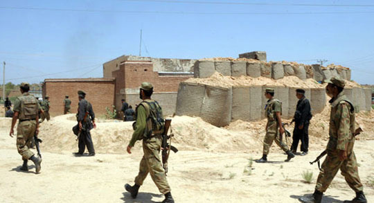 6月24日, 塔利班武装分子袭击了巴基斯坦西北部城市白沙瓦郊区的一处检查站,3名警察被打死。图为巴基斯坦警察在袭击事件现场巡逻。