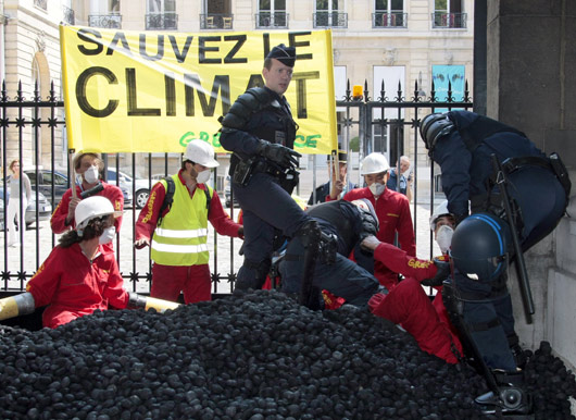 6月23日,“绿色和平”环保组织成员将煤倾倒在位于巴黎的法国生态部门前并举行静坐示威,以抗议法国在西北部瑟堡港兴建煤炭码头的计划。