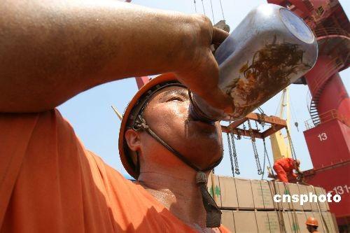 6月25日,江苏连云港最高气温上升到35℃,当地气象台发布了今年首个高温黄色预警信号,提醒市民注意防暑降温。中新社发 王健民 摄