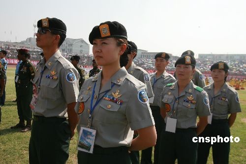 图为韩国英姿飒爽女跳伞队员在国际军事跳伞赛上亮相。中新社发 王中举 摄