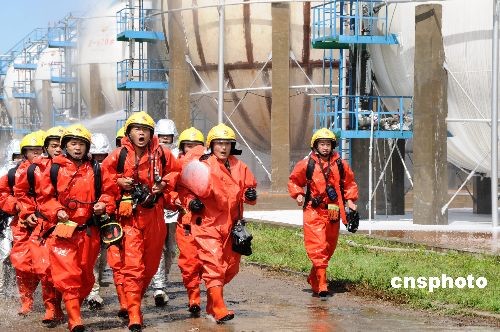 6月25日,在全国第八个“安全生产月”活动中,辽宁锦州针对石化生产特点,开展突发事故应急处理演练,模拟液化气球罐R-621根部法兰泄漏事故启动抢险预案,调集救援力量赶赴现场,对泄漏区域进行隔离封锁,同时展开有效的灭火救援工作,共600多人参与此次演练。中新社发 张一峰 摄