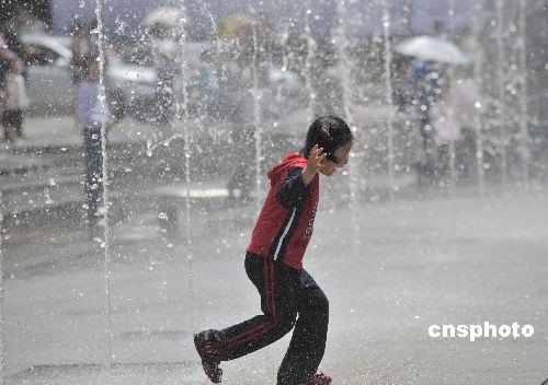 2009年6月25日,全国17个省市出现高温。华北大部、黄淮、江淮、江汉、江南北部及西北五省有35℃以上高温,北京、天津、山西、山东、陕西东部、河南中北部等地最高气温达37-39℃。图为辽宁省沈阳市中山公园,儿童在音乐喷泉的水中冲凉玩耍,躲避炎热的高温天气。 中新社发 徐建国 摄