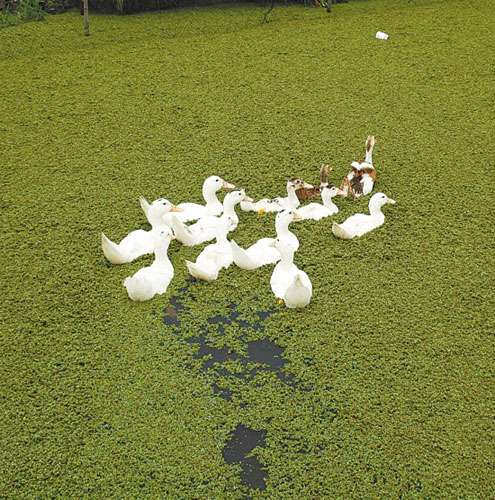 24日,在温岭市一处河面上,一群鸭子在密密实实的绿藻中艰难前行,远远看去,它们像走在草地上一样。近期,由于天气原因和水体的富营养化,温岭不少河道里都被疯长的绿藻污染,许多河面像被泼了绿漆似的。