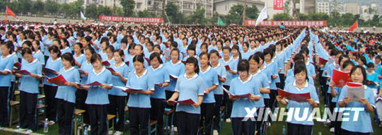 6月25日,在四川邻水县邻水实验中学体育场,来自众多学校的上万名师生齐声诵读国学经典。