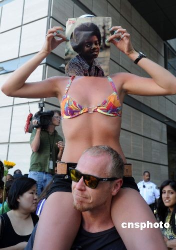 自封为“流行天王”的美国著名歌星迈克尔·杰克逊当地时间六月二十五日在洛杉矶病逝,终年五十岁。消息传出后,近千名歌迷赶往救治杰克逊的加州大学洛杉矶分校医疗中心,一位身穿比基尼的女歌迷手持杰克逊少年照表达哀思。中新社发 张炜 摄