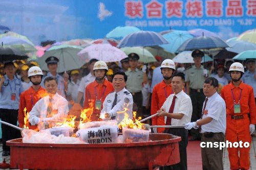 六月二十六日上午,中越两国四省区禁毒机构在广西东兴市联合行动,焚烧730公斤毒品。越南凉山、广宁、高平三省禁毒代表团出席了焚烧行动。