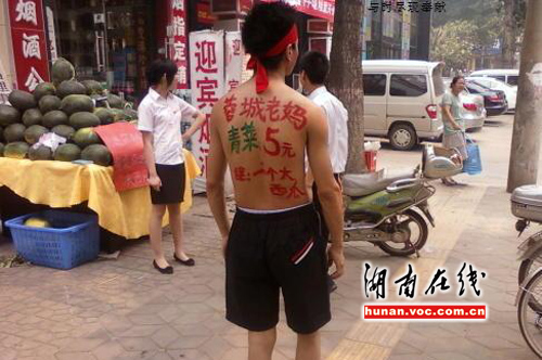 头扎红巾,两颊涂红,赤裸上身,右手手臂用红笔写着“蓉城老妈”。左手手臂写着“香飘万家”,四个男子的扮相很雷人。各个胸前都画着大西瓜,背后写着“青菜五元”。路过的行人见状莫不指指点点,掩嘴而笑。