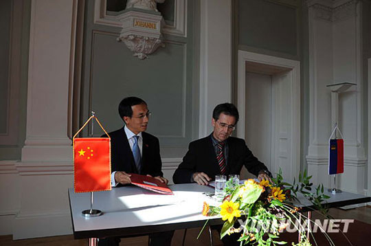 6月25日,在列支敦士登首都瓦杜兹,列政府总代表海姆勒(右)签署列参加2010年上海世博会合同,中国驻苏黎世兼驻列支敦士登总领事李晓驷(左)出席签字仪式。这是列支敦士登第三次参加世博会,也是首次到欧洲以外地区参加世博会。(姚馨摄)
