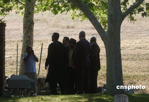 图为2005年6月迈克尔杰克逊最后离开“梦幻庄园”时,亲属和保安们在门前。中新社发 贾国荣 摄