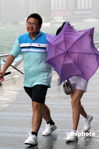 六月二十六日午时,二位游人顶着阵阵强风,艰难地行走在香港尖沙咀星光大道。当日,热带风暴“浪卡”逼近香港,香港天文台在下午三时四十分发出三号强风信号。中新社发 郑祚声 摄