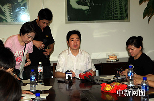 图为闵行区宣传部副部长陈志强向记者发布事故信息。