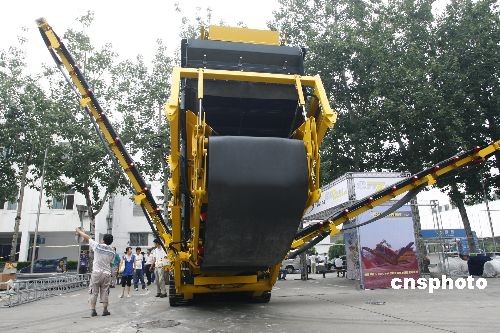 6月27日,一辆巨型“移动式破碎筛分机”亮相北京中国国际展览中心,为28日开幕的“2009第五届北京国际煤炭装备及矿山技术设备展览会”造势。中新社发 郑雄增 摄