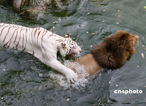 趣图:狮虎水中嬉戏躲避酷暑高温(2)