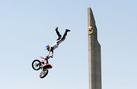 6月27日,在白俄罗斯明斯克举行了一场越野摩托车特技表演。图为一名摩托车手在进行飞跃特技表演。