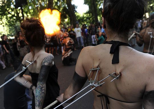 组图:另类团体街头表演人体挂铁钩拉车(4)