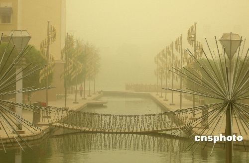 6月30日,新疆吐鲁番市区笼罩在浓浓的浮尘之中,市区最大能见度只有50米左右,空气中弥漫着呛人的沙土味。据了解,从29日夜间开始,持续多日40摄氏度以上高温的吐鲁番盆地遭遇大风袭击,三十里风区和托克逊县等风口地区的风力达到8级以上,瞬间风力达到12级左右。