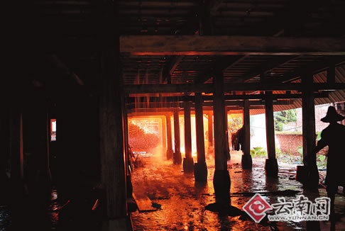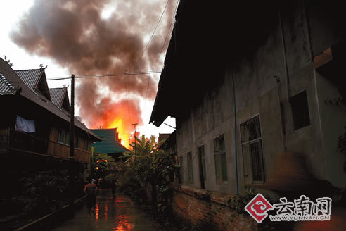 与此同时,发现房屋起火的村民也跑到村寨办公室,用高音喇叭通知村民赶来救火。等玉温接到儿媳电话赶回来时,大火已经烧得通红,现场赶来的数十名村民已经开始用脸盆和水桶接水救火了。随后赶来的公安民警、以及从远处的曼春满、曼听等村寨赶来的村民也纷纷加入到了救火队伍中。