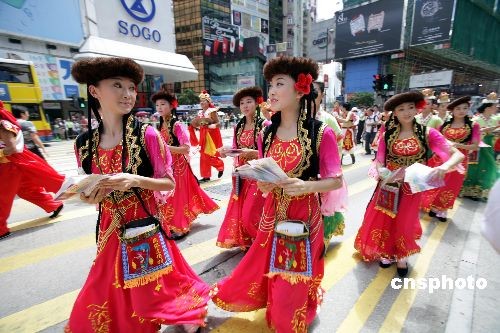 图为身穿少数民族服饰的靓丽少女沿途受到民众欢迎。中新社发 洪少葵 摄