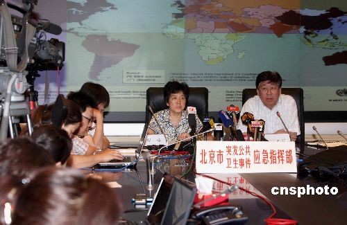 7月1日晚8时,北京市卫生局通报,该市朝阳区南湖中园小学发生一起学校聚集性发热疫情,图为发布会现场。中新社发 张宇 摄