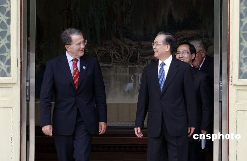 7月2日,中国国务院总理温家宝在北京中南海紫光阁,会见来京出席“全球智库峰会”的前欧盟委员会主席、意大利前总理普罗迪,美国前国务卿基辛格,世界知识产权组织总干事高锐,联合国贸易和发展会议秘书长素帕猜等外方代表。