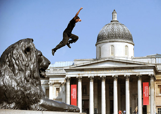 2009年7月2日,伦敦,Barclaycard世界跑酷冠军赛当日在特拉法尔加广场举行媒体发布仪式。正式比赛将于8月15日举行。