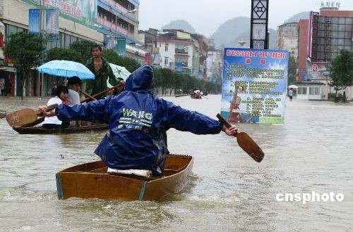 图:广西融水遭洪水袭击 城区被淹街上泛舟(2)