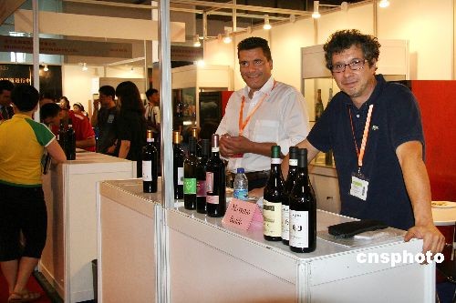 欧洲参展商向国内来宾促销葡萄酒。中新社发 黄宁 摄