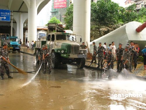 7月6日清晨,驻柳部队战士赶到滨江路红光桥底路段,与市民一起清理洪水过后堆积的淤泥。当日上午,柳江河水位回落至警戒水位。中新社发 曹伟军 摄