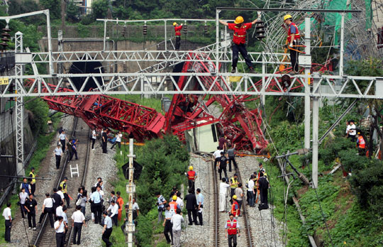 7月6日,韩国首尔一处位于铁路旁的高50米的工地塔吊倒塌,造成一名塔吊操作员死亡,铁路运输中断数小时。