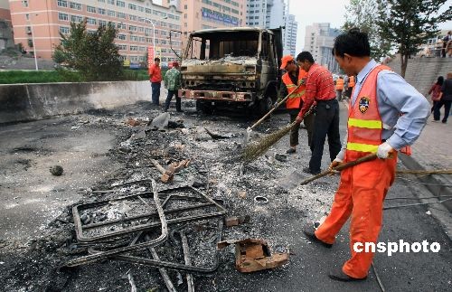 7月6日,乌鲁木齐市的工作人员在清理被犯罪分子焚烧的汽车。在5日晚发生的严重暴力犯罪事件中,被毁车辆达260部;受损门面房203间,民房14间,总过火面积达到56850平方米,全市共有220多处纵火点,有两栋楼房被烧毁。中新社发 刘新 摄