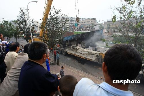 7月6日,乌鲁木齐市的工作人员在清理被犯罪分子焚烧的汽车。中新社发 刘新 摄
