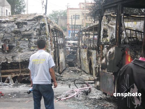7月6日,乌鲁木齐市一位市民注目被犯罪分子焚烧的汽车。在7月5日晚发生的严重暴力犯罪事件中,被毁车辆达260部。中新社发 钟新 摄