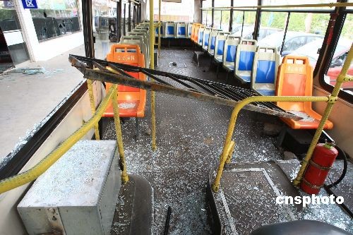 7月6日,乌鲁木齐市街头被犯罪分子摧毁的公共汽车。在5日晚发生的严重暴力犯罪事件中,已造成140人死亡,800多人受伤;被毁车辆达260部;受损门面房203间,民房14间,总过火面积达到56850平方米,全市共有220多处纵火点,有两栋楼房被烧毁。中新社发 钟新 摄