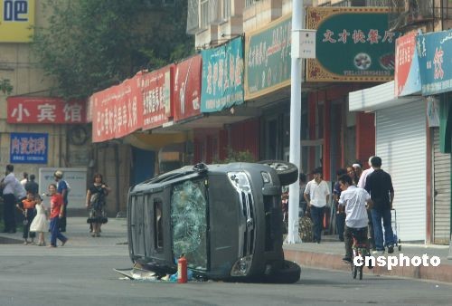 7月6日,乌鲁木齐市被犯罪分子洗劫的汽车。在5日晚发生的严重暴力犯罪事件中,已造成140人死亡,800多人受伤;被毁车辆达260部;受损门面房203间,民房14间,总过火面积达到56850平方米,全市共有220多处纵火点,有两栋楼房被烧毁。中新社发 钟新 摄
