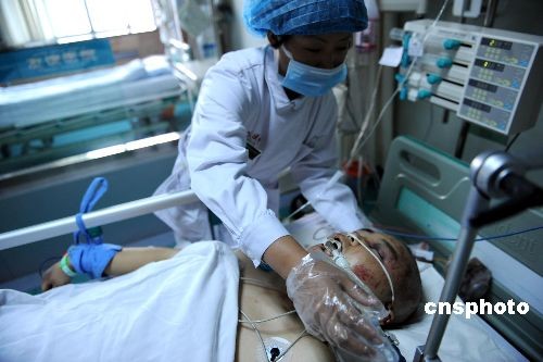 7月6日,新疆乌鲁木齐友谊医院重症监护室,医务人员精心护理在暴力事件中被暴徒打成重伤的受害者。