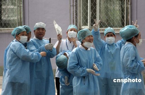 2009年7月7日上午,南湖中园小学甲流密接者隔离点--如家酒店奥运村店,医务人员打出胜利的手势。