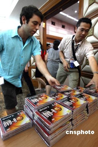 7月7日,中国外交部新闻发言人秦刚在例行记者会上表示,希望前往新疆采访7·5打砸抢烧事件的中外记者注意安全,公正报道此次事件。此次,外交部将编辑好的该事件影像材料制作成光盘送给记者。图为会后中外记者自取光盘。中新社发 张宇 摄